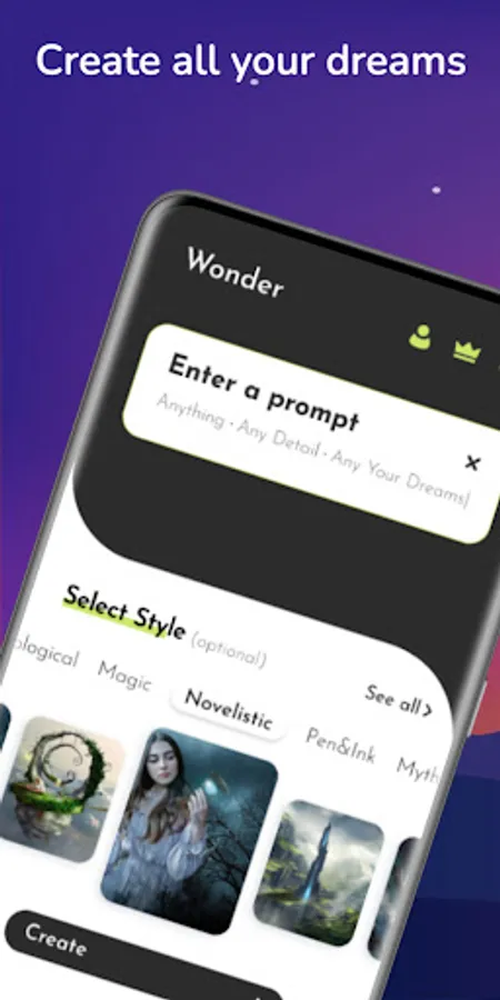 Just enter a phrase or idea, choose an artistic style and watch Ai Studio bring your idea to life in seconds!