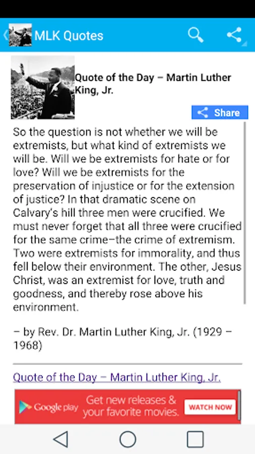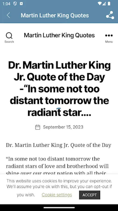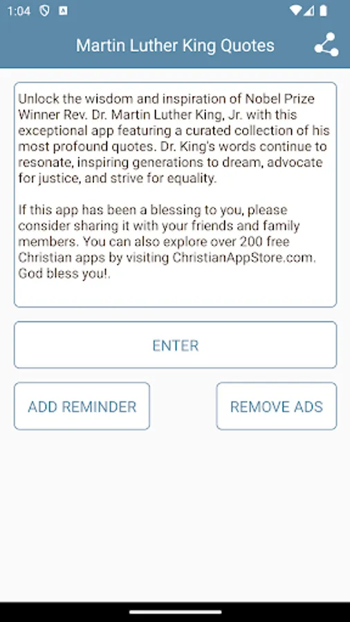 🔍 Search and Share: Easily find quotes on specific topics or share your favorite quotes with friends and family to spread Dr. King's message of hope.