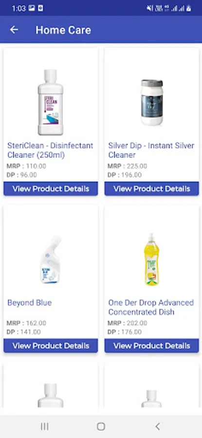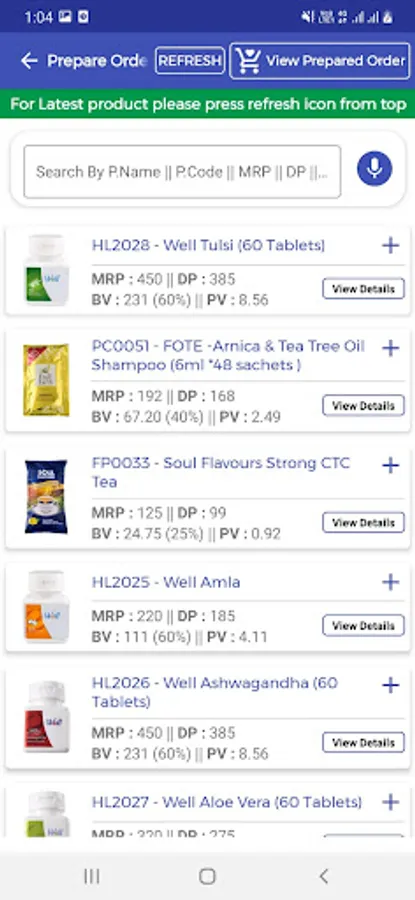 - Product List with product Maximum Retail Price (MRP), Distributor Price(DP), Business Volume(BV), Point Value (PV), Product Code of each product with its Image.