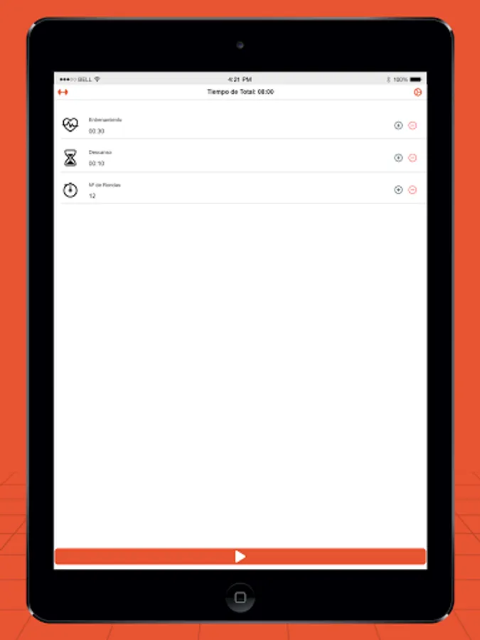 Tabata Timer: HIIT Lose Weight session consists of a warm-up exercise period, followed by six to twelve repetitions of high-intensity exercise, separated by medium-intensity exercise, and ending with a cool-down exercise period. High-intensity exercise should be done at near maximum intensity. The medium exercise should be approximately 50% intensity. The number of repetitions and the duration of each depends on the exercise. The goal is to do at least six cycles, and to have the entire HIIT session last at least fifteen minutes and no more than twenty.