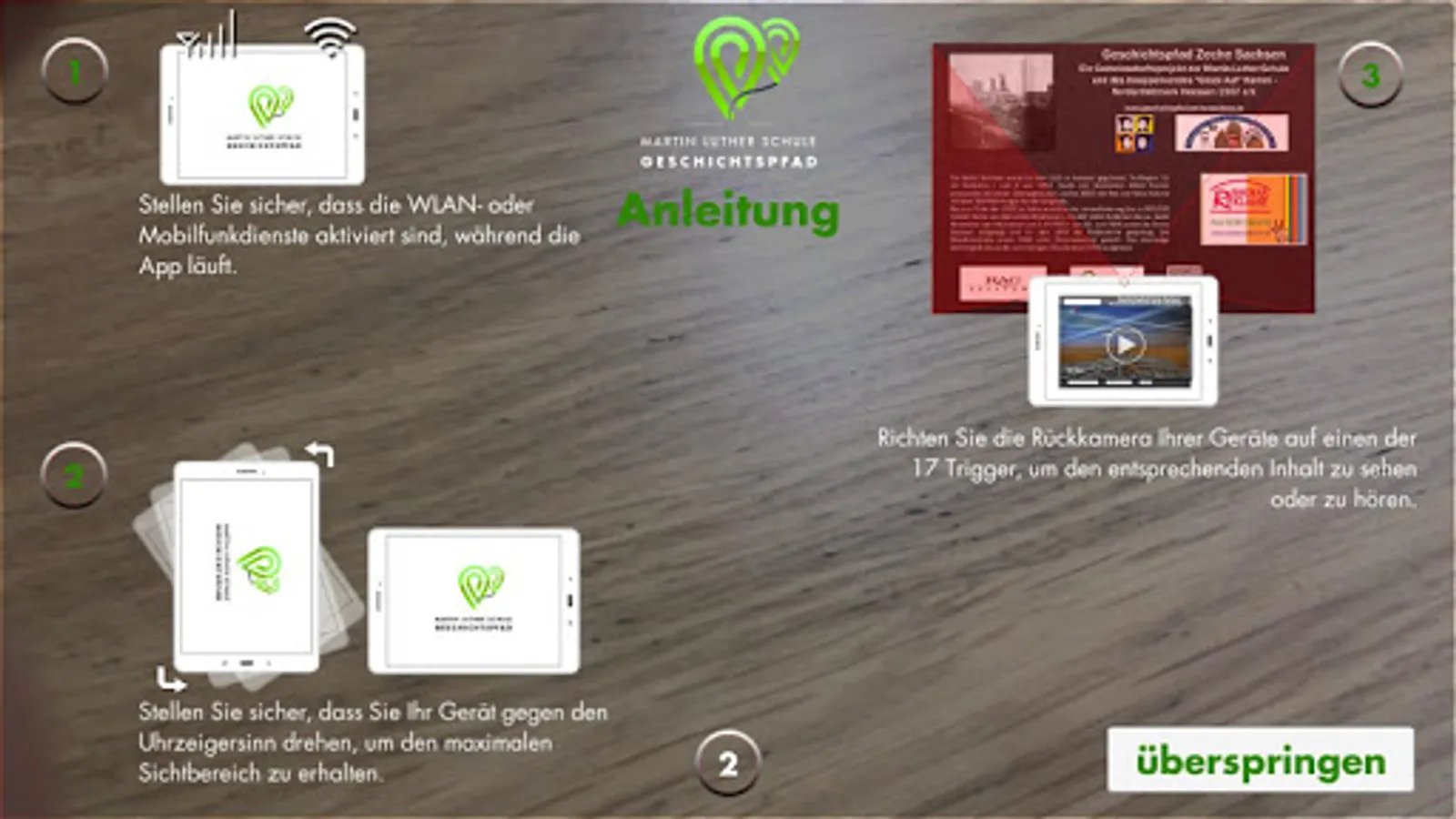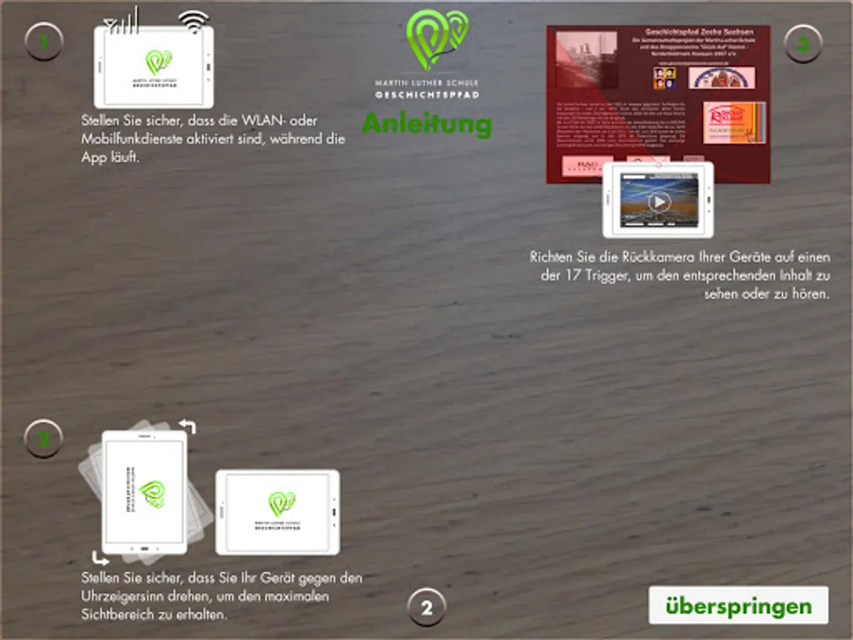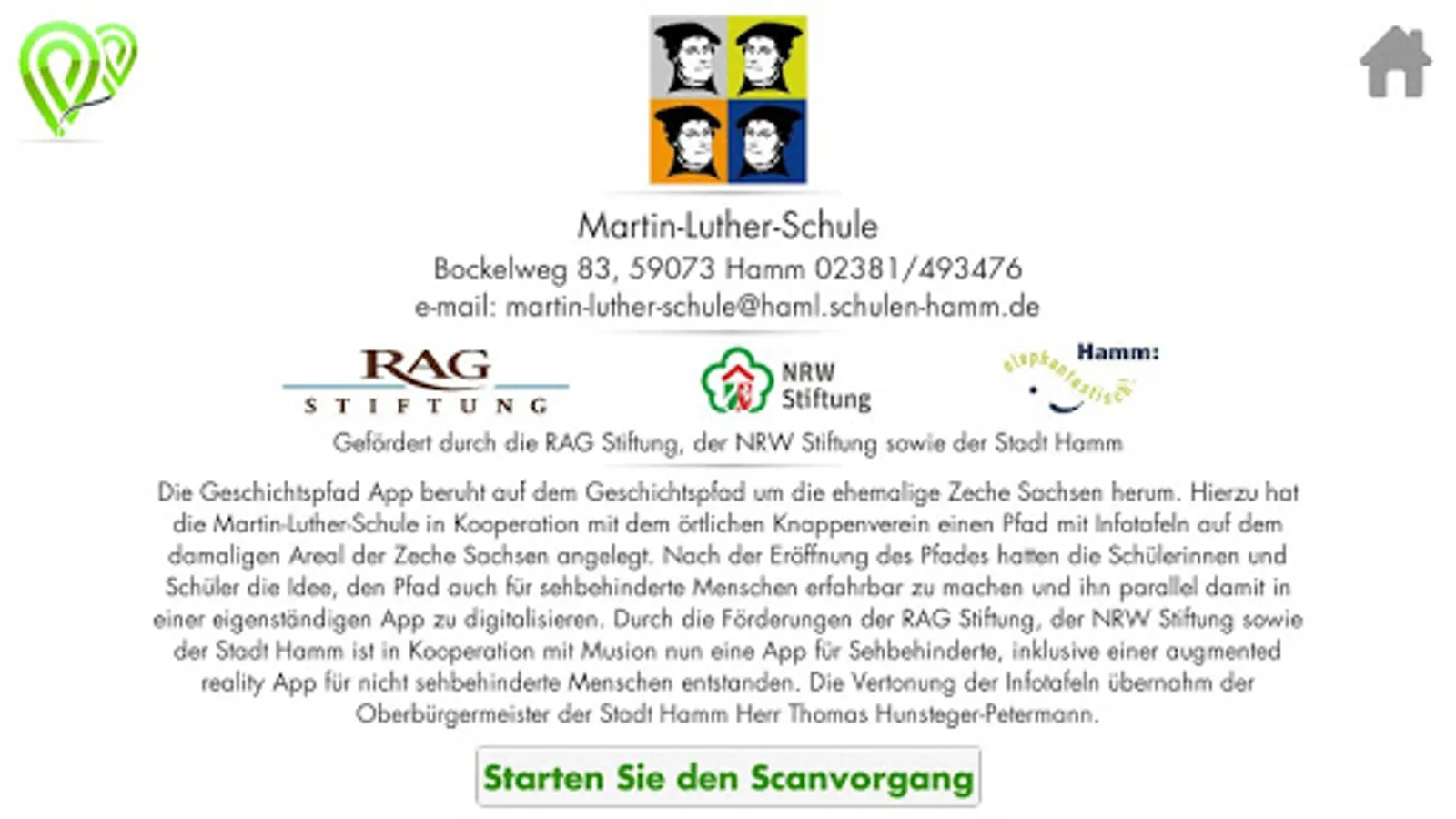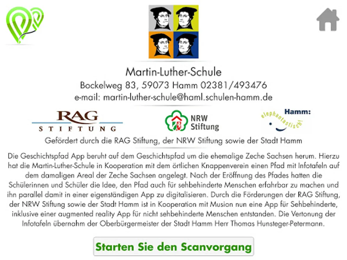 The history trail app is based on the historical trail around the former coal mine Saxony. To this end, the Martin Luther School in cooperation with the local Knappenverein has created a path with information boards on the former site of the Saxon mine. After the opening of the path, the pupils had the idea to make the path accessible to visually impaired people and digitize it in parallel in a stand-alone app. Thanks to funding from the RAG Foundation, the NRW Foundation and the City of Hamm, an app for the visually impaired, including an augmented reality app for visually impaired people, has been developed in cooperation with Musion. The scoring of the information boards was handled by the mayor of the city of Hamm, Thomas Hunsteger-Petermann.