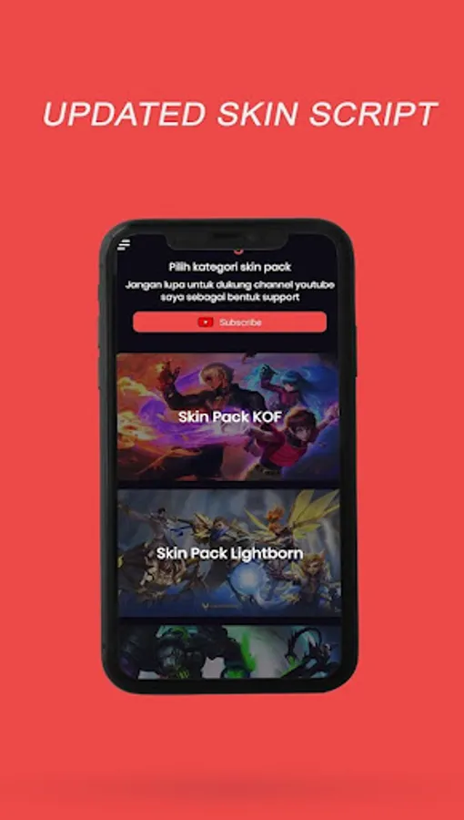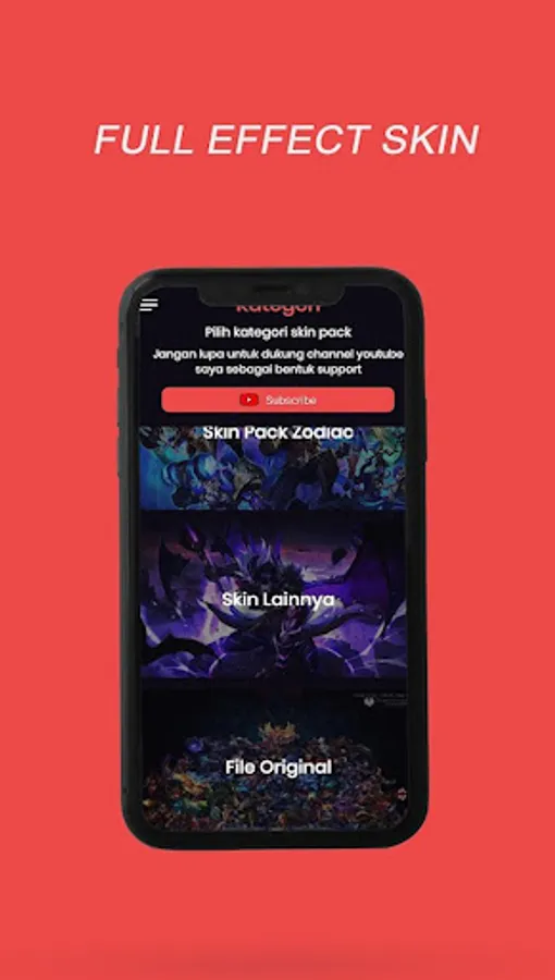 Pada aplikasi ini tersedia banyak MOD SKIN dan juga file aslinya yang dapat didownload dan dipasang secara langsung tanpa ribet. MOD SKIN akan ditambahkan setiap saat tanpa harus update aplikasi di playstore, nanti akan ada notifikasi ketika ada update MOD SKIN yang baru.