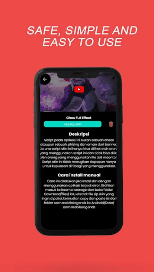 DISCLAIMER : APLIKASI INI BUKAN PRODUK RESMI GAME MANAPUN. Kami sama sekali tidak mengklaim hak cipta atau kekayaan intelektual apapun. Seluruh hak cipta sesuai dengan ketentuan. MOD SKIN pada aplikasi ini hanya bentuk visual saja untuk yang menggunakan, dan tidak berpengaruh pada orang lain dan gameplay game.