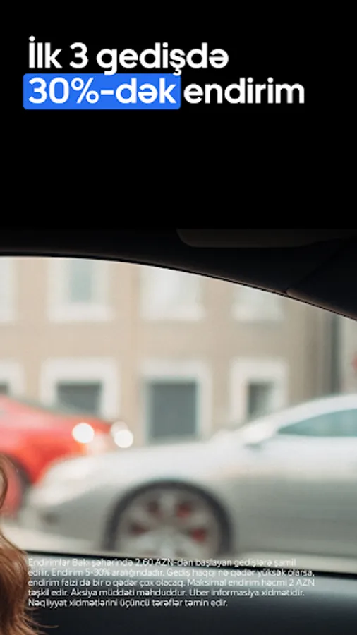 Discounts apply to rides that cost at least 2.60 AZN in Baku. Discount ranges from 5% to 30%. The more a ride costs, the greater the discount percentage is. Maximum discount is 2 AZN. Promotion available for a limited time only. Uber is an information service. Transportation services are provided by third parties.