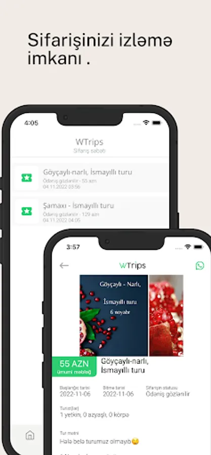 WTrips.Az tətbiqinin yaranmasında məqsəd Azərbaycan vətəndaşlarının və eyni zamanda respublikamızın qonaqlarının ölkəmizin gözəl guşələrinə təşkil etdiyimiz turlar, digər turizm məhsulları haqqında məlumatı daha qısa yolla çatdırmaq, online olaraq, turların sifarişi və ödənişinin tətbiqi ilə innovativ bir xidmət göstərməkdir.