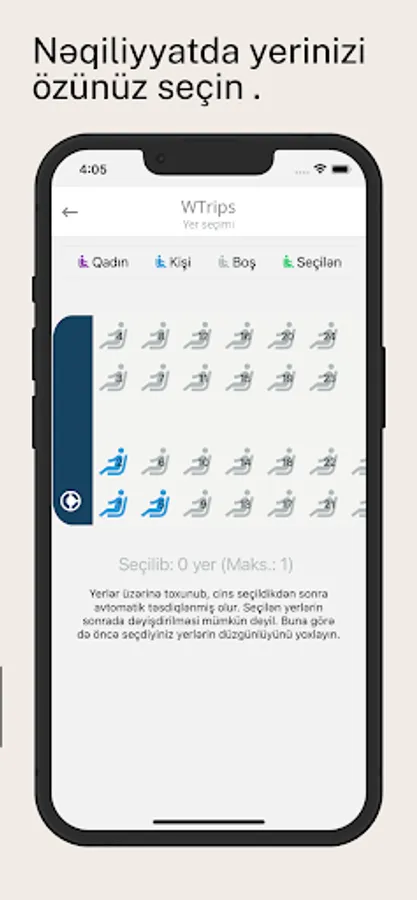 Tətbiq daxilində turlara baxmaqla, ürəyinizcə olan turu seçib onu səbətə əlavə edə bilərsiniz. Ödənişi etdikdən sonra isə avtobusda yer seçimi etmək mümkün olacaq. Tətbiq bütün prosesləri keçdikdən sonra sizin üçün QR bilet hazırlayır. Bu bilet əsasında sizin sifariş məlumatlarınız tur bələdçisinə verilmiş olur.