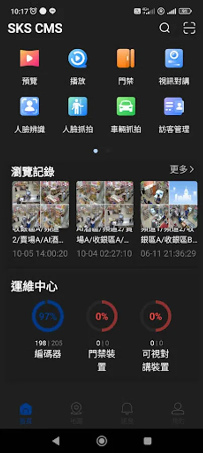 SKS CMS II is based on application design and is divided into four major applications: monitoring center, event center, intelligent search and access control management. It has functions such as real-time viewfinder, image playback, map, alarm push, face recognition, and visitor access.