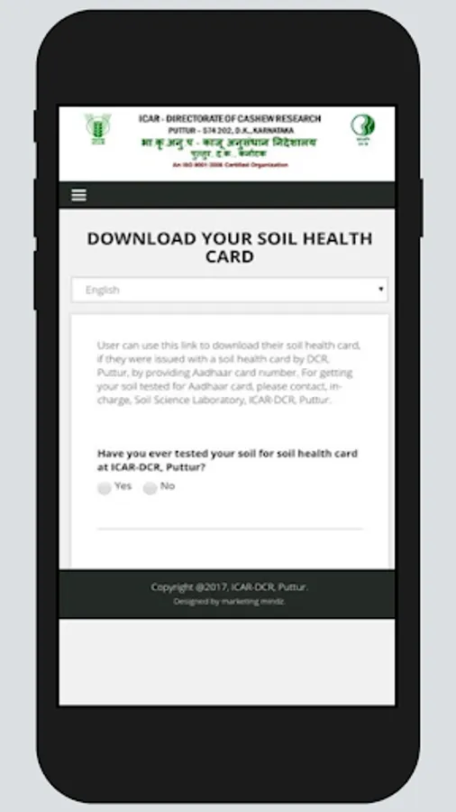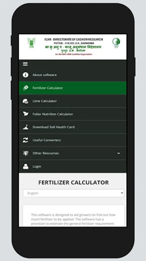 DCR-Cashew Nutrient Manager has been developed by ICAR-Directorate of Cashew Research, Puttur with funding support of RKVY-RAFTAAR, Government of Karnataka. The app is developed to assist farmers and other stake holders in calculating the fertilizer requirement of cashew and apply nutrients as per the need of the plant and based on soil fertility levels. This shall help to avoid unnecessary excess application of fertilizer which can lead to wastage of resources and pollution of environment. Under application of fertilizer to the crop lead to reduced yield. Presently the app is available in two languages (English and Kannada). The app is designed to assess fertilizer requirement in all cashew growing regions of India.