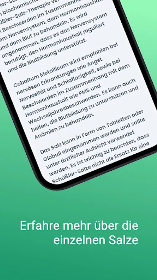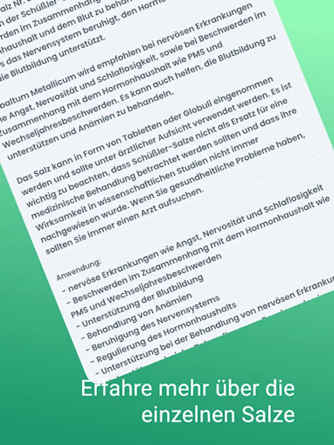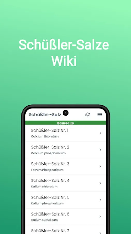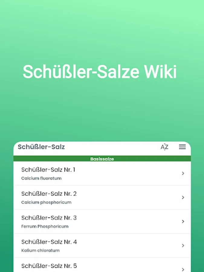 The Schüßler-Salze Wiki App is a free mobile application that allows you to find out about the various salts and their areas of application. You can get an overview of the 36 different salts and see detailed application information on the pages of each salt.