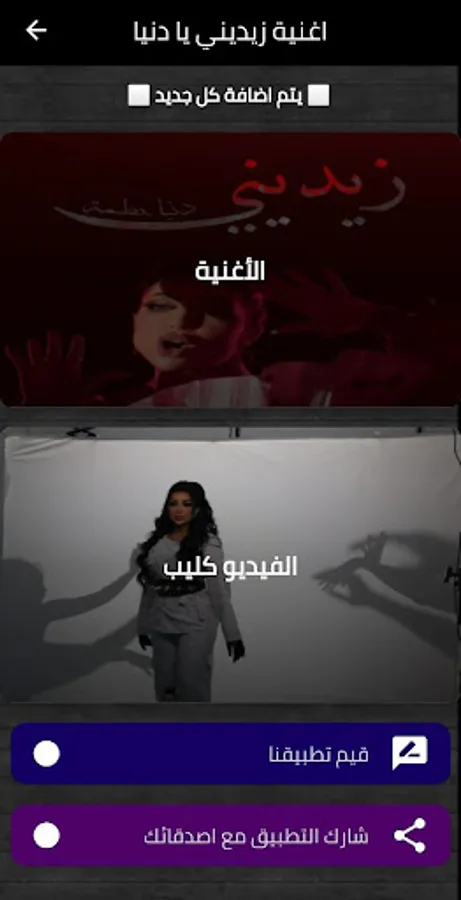 The Zaydini Ya Dunya song application contains the Zaydini Ya Dunya song for Dunya Batma placed in an audio recording in the application and below the audio recording the lyrics of the Zaydini Ya Dunya song in a beautiful and clear font that everyone can understand