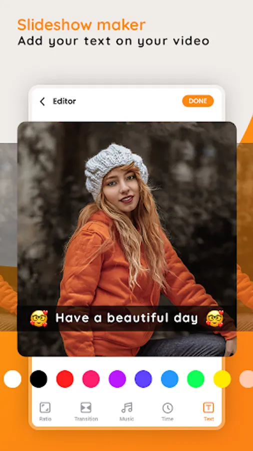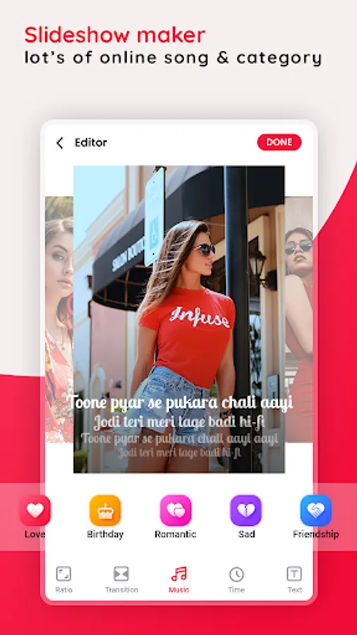 * Music: The app provides melodies that match every video theme. You can also add your favorite songs and music tracks from the device to make your videos interesting and engaging.