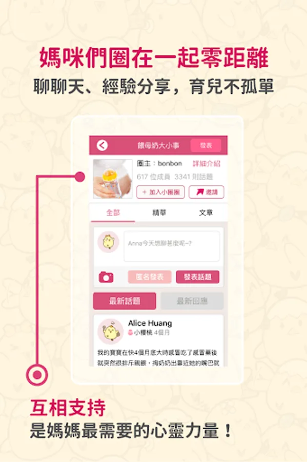 在這裡,「小圈圈」是一個爸媽互相交流的熱門討論區。系統貼心掌握您所有發表的話題、追縱的話題,並且依據您的設定來提醒話題的最新動態。爸媽們不但可隨時發表話題,也可以隨時參與別人的話題討論,表達自己的經驗,透過親身的經驗支持、幫助其他人,還能獲得好雞金點數哦!