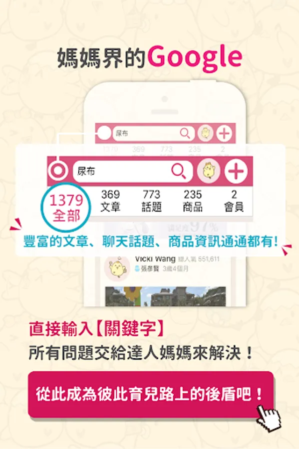 收藏文章數量高達20,000篇以上,內容包括了「懷孕知識」、「親子知識」、「媽咪時尚」...等許多好文法寶,只要在「搜尋」裡打上關鍵字,系統就會自動將您的搜尋結果依序「文章」、「話題」分類呈現於頁面,讓您有系統的閱讀了解各種關於孕期、親子互動等相關資訊。