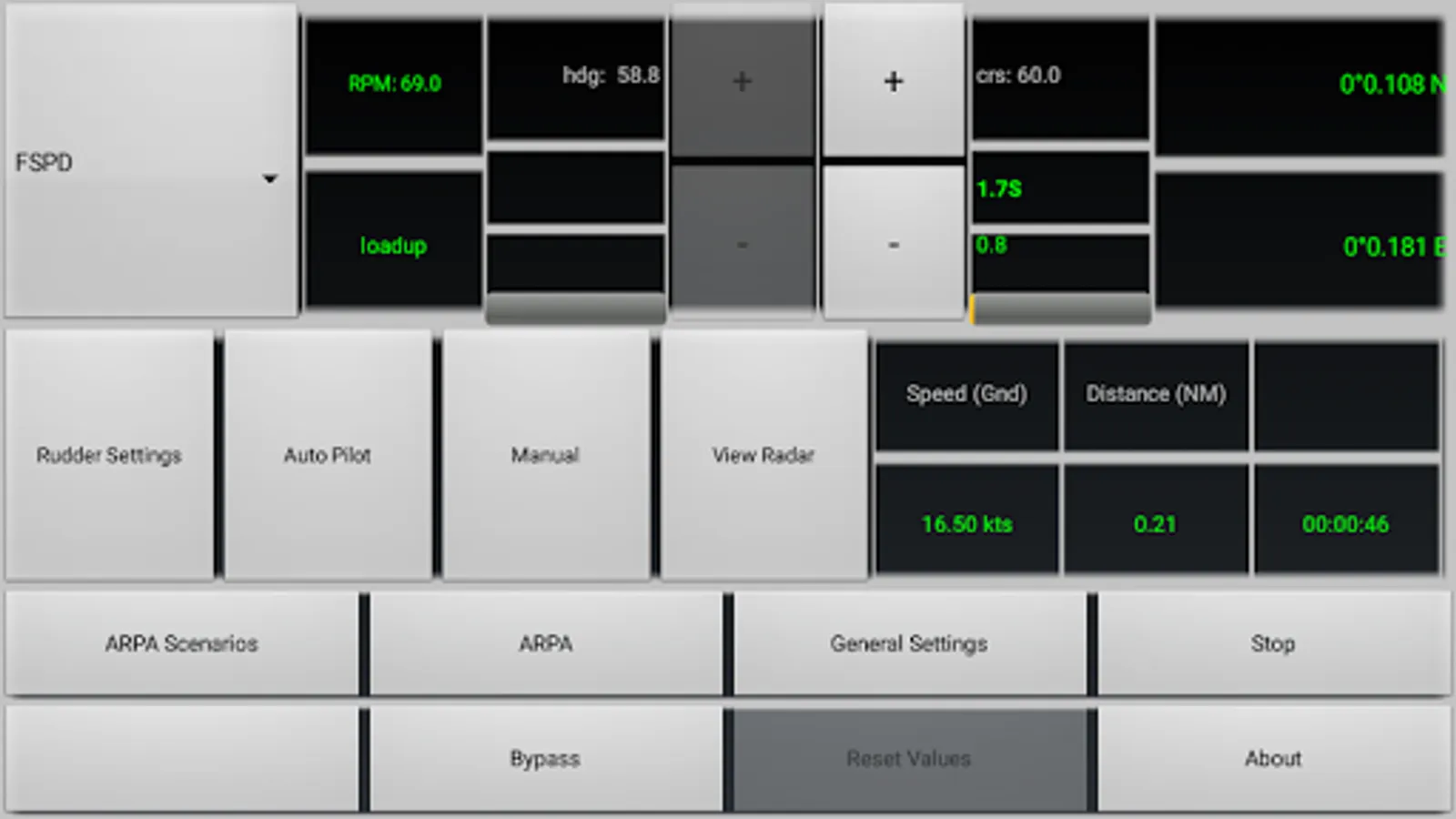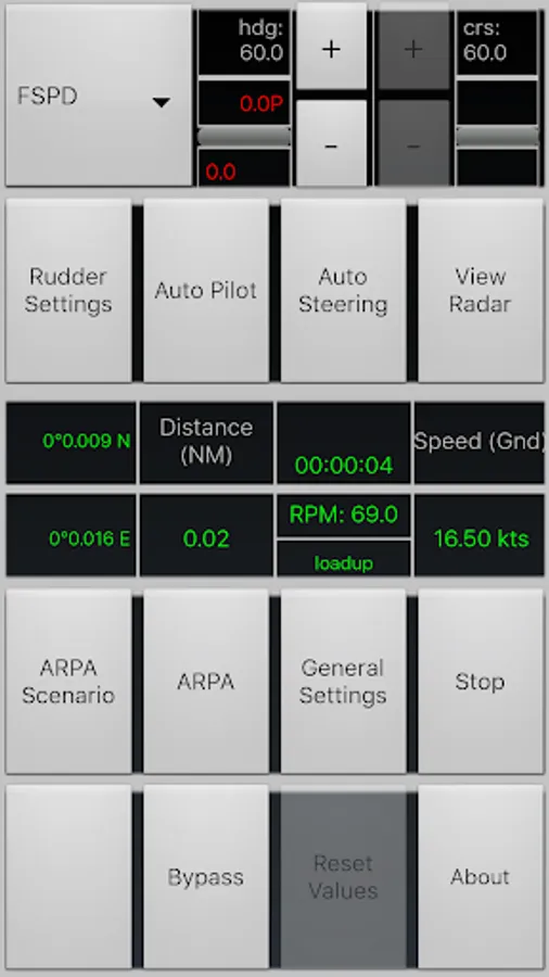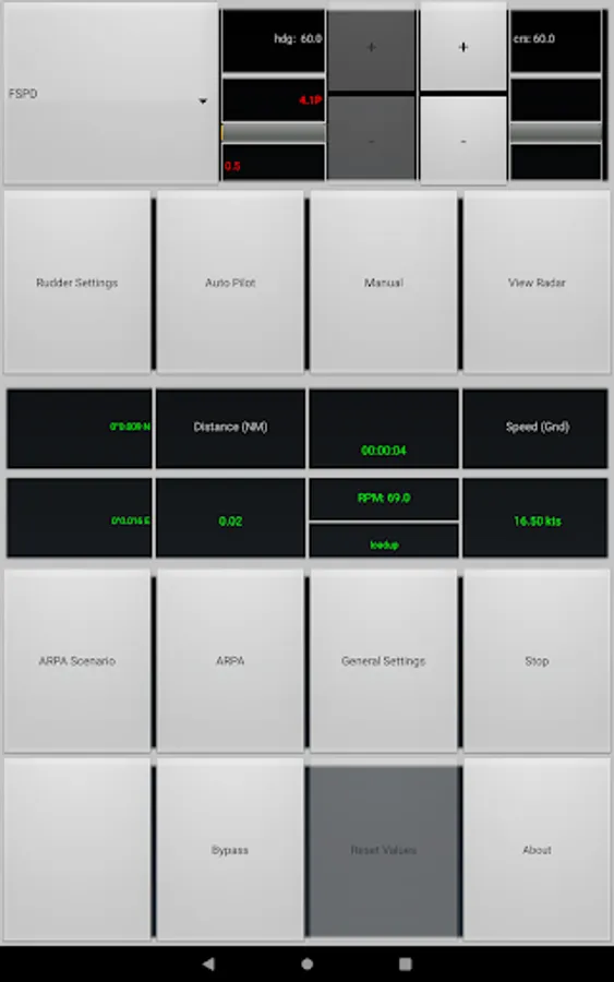 Ship manoeuvring: the app contains a real time accurate manoeuvring model, that simulates accurately the behavior of a real ship. The auto pilot unit is customizable; you can adjust its parameters to alter the steering behavior, and plot the behavior in a graph.