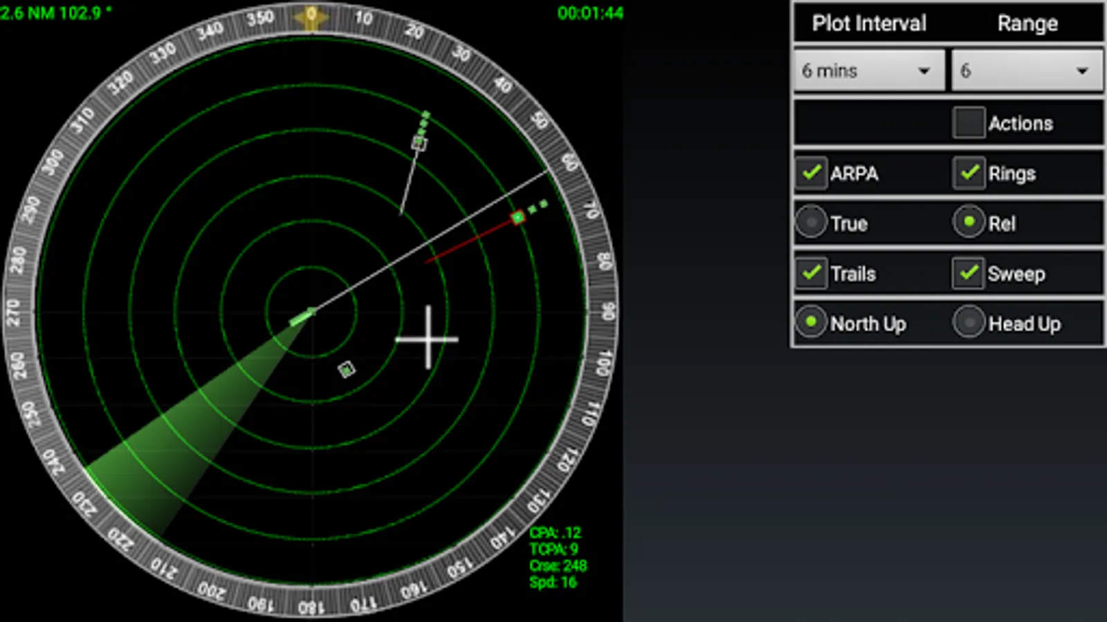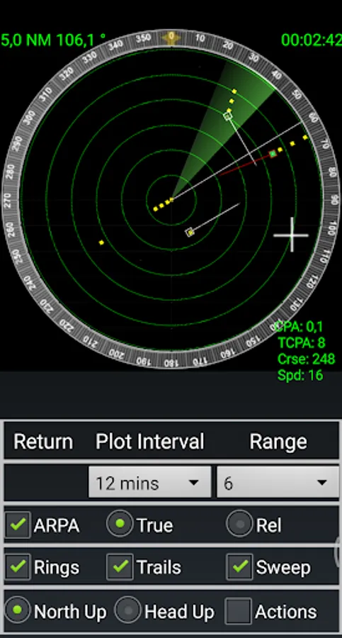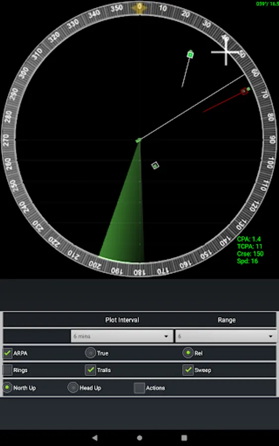 The RADAR view shows all targets on screen, either in relative or true motion, and using the cursor you can get information about CPA, TCPA, course and speed for each target.