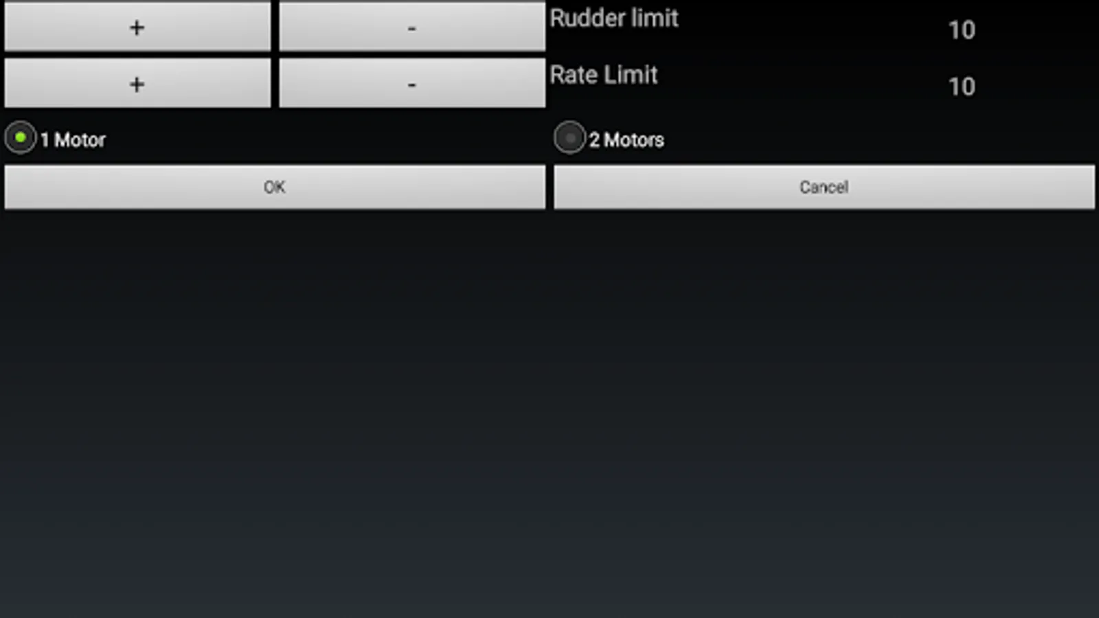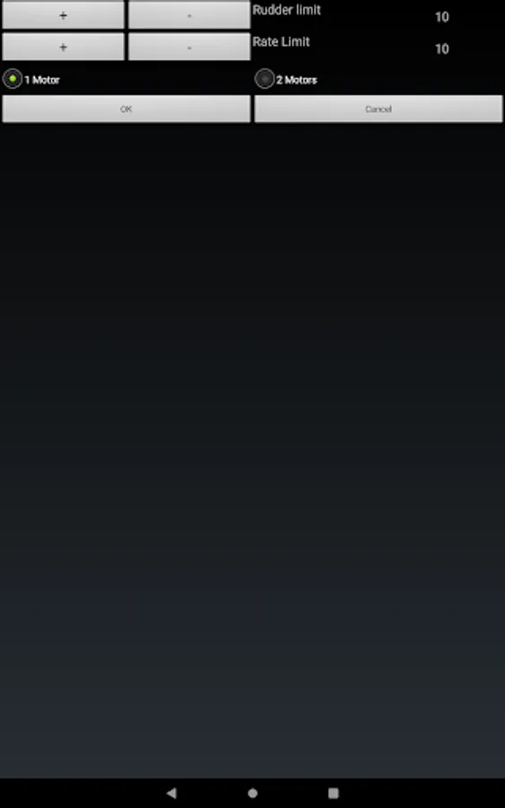 Rudder: you can choose if you wish to use one or two steering motors, and you can set the rudder limit and rate of turn limit (when in auto pilot mode).