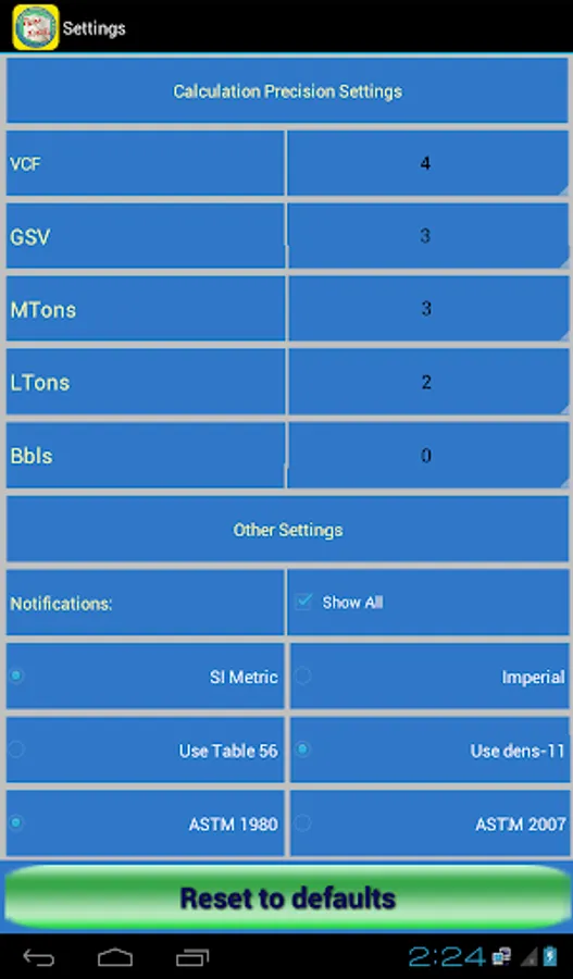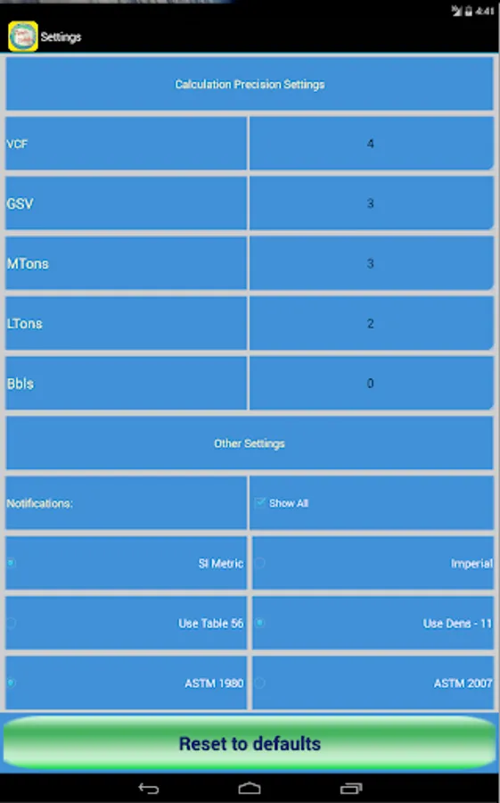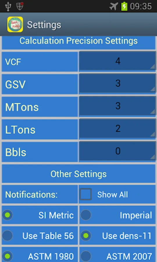The app can calculate using both SI Metric and Imperial standards (i.e both ASTM table 54 and table 6), and the user can choose whether to use ASTM tables edition 1980 or edition 2004 (with 2007 amendments).