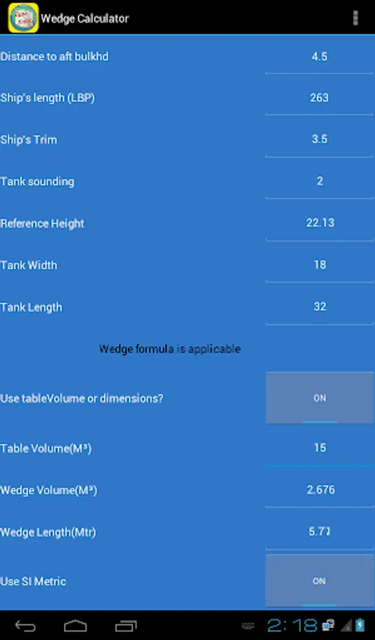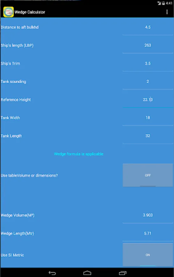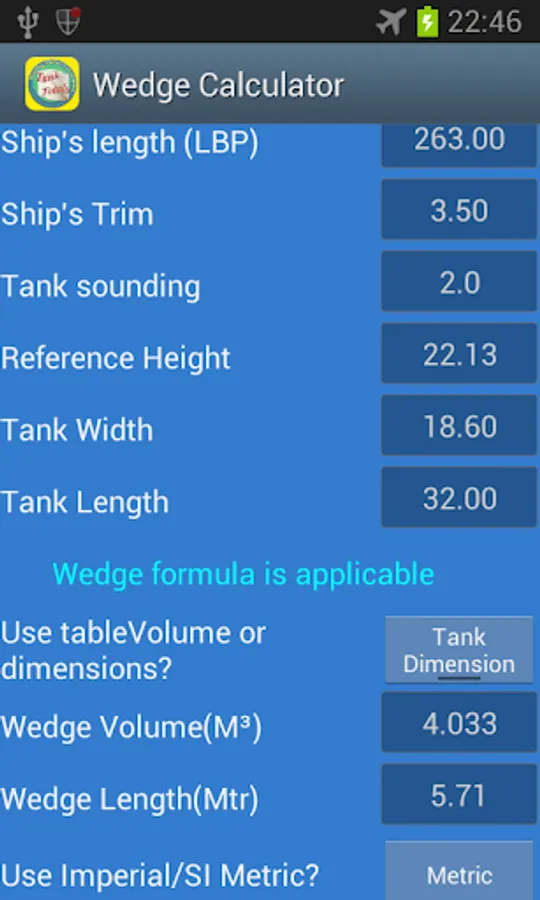 Also included in the app is a wedge calculator, with options to compute wedge volume based on tank physical dimensions, or based on calibration table volume. Data in the wedge calculator can be entered either in SI Metric or Imperial units, and can be converted both ways automatically.