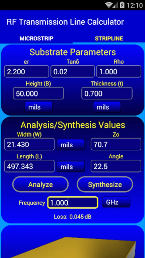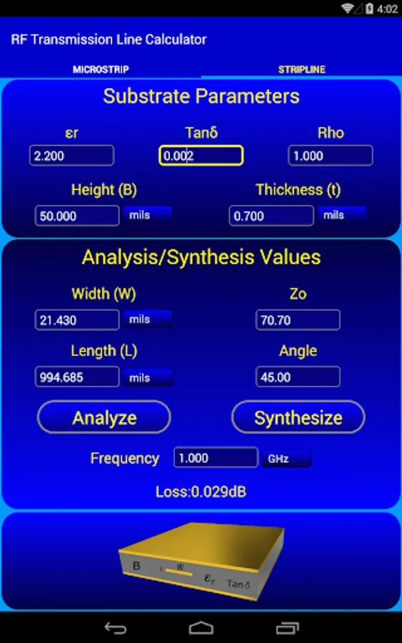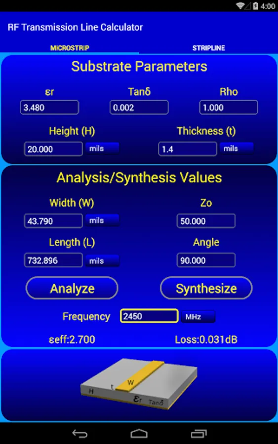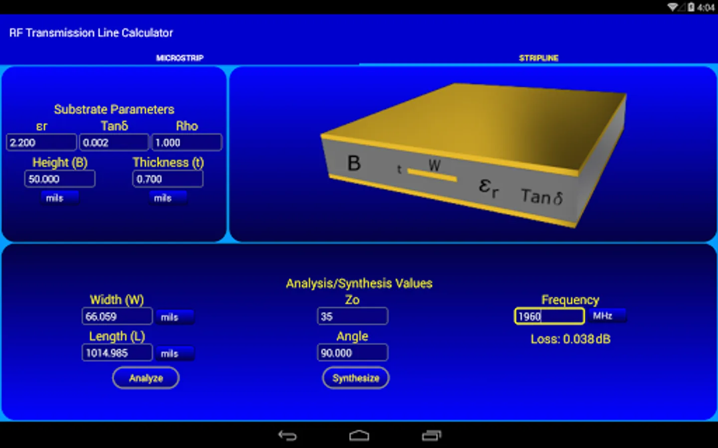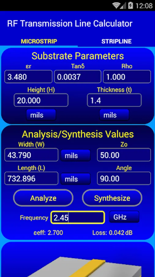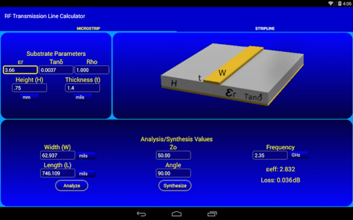 A tool to analyze and synthesize RF and microwave transmission lines based on physical substrate parameters. This tool can be used to calculate line widths and thicknesses with a given characteristic impedance and wavelength. It can also be used to analyze the impedance and wavelength of an existing line by entering its width and length.