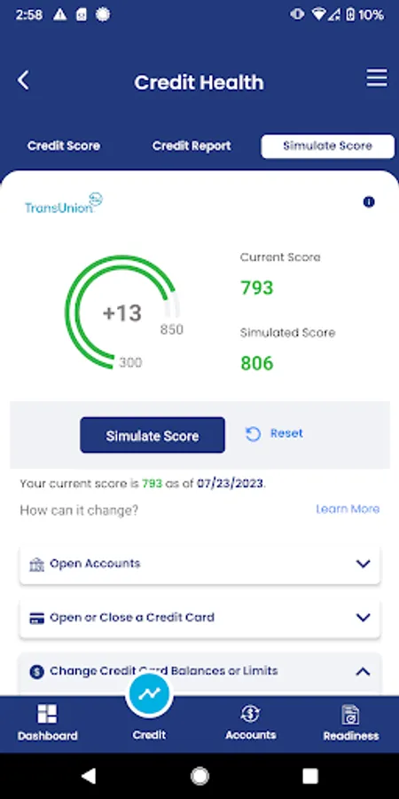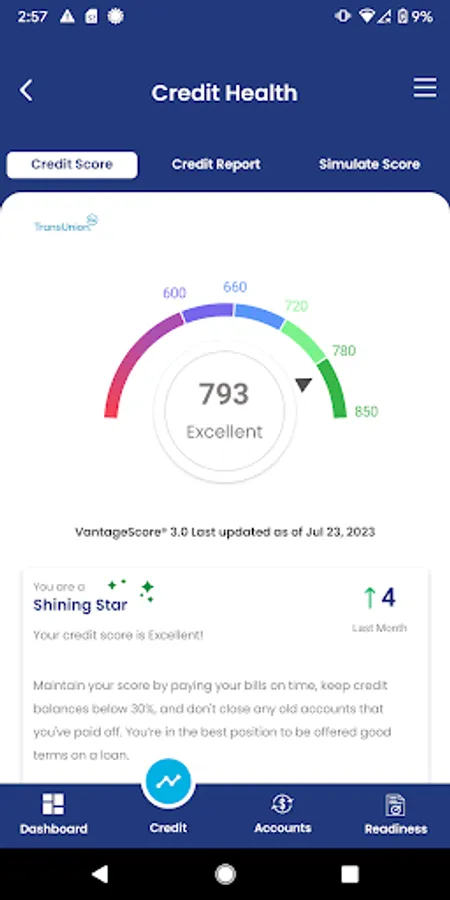 Your credit score is prominently displayed in your dashboard - and it doesn't cost you anything. Track changes month to month and learn the key factors that make up your score like length of credit, timely payment history, utilization of credit, total accounts opened and inquiries. Don't worry, this is a "soft credit pull" meaning there is no impact to your score by checking it. Look through your credit report for accuracy. Access helpful articles that explain credit bureaus, credit score, and more.