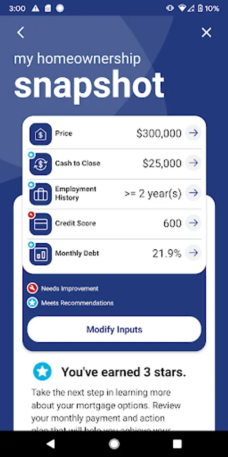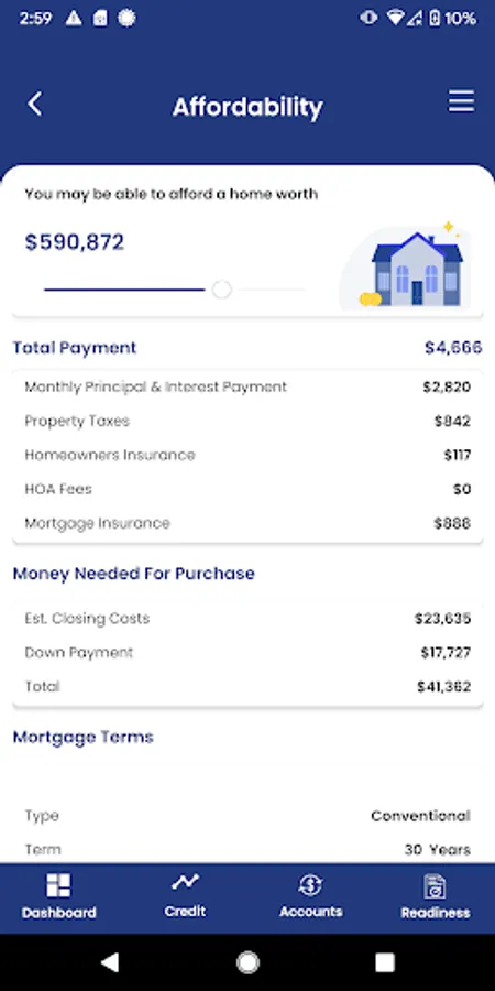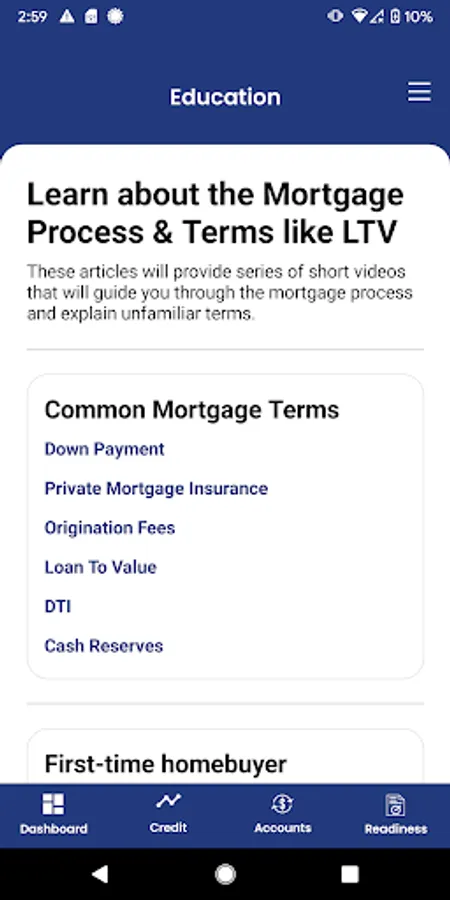 Work with your financial partner or institution to best prepare you for home ownership by planning for a down payment, establishing reserves, managing your debt to income ratio, improving or maintaining your credit, loan scenarios through our calculators, establish your projected loan to value, and more. Visit the readiness assessment in your app to see a snapshot of your credit overview, debt to income ratio, cash reserves, employment, down payment and sales price.