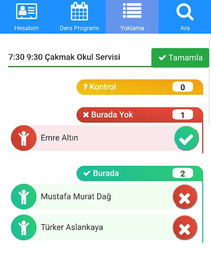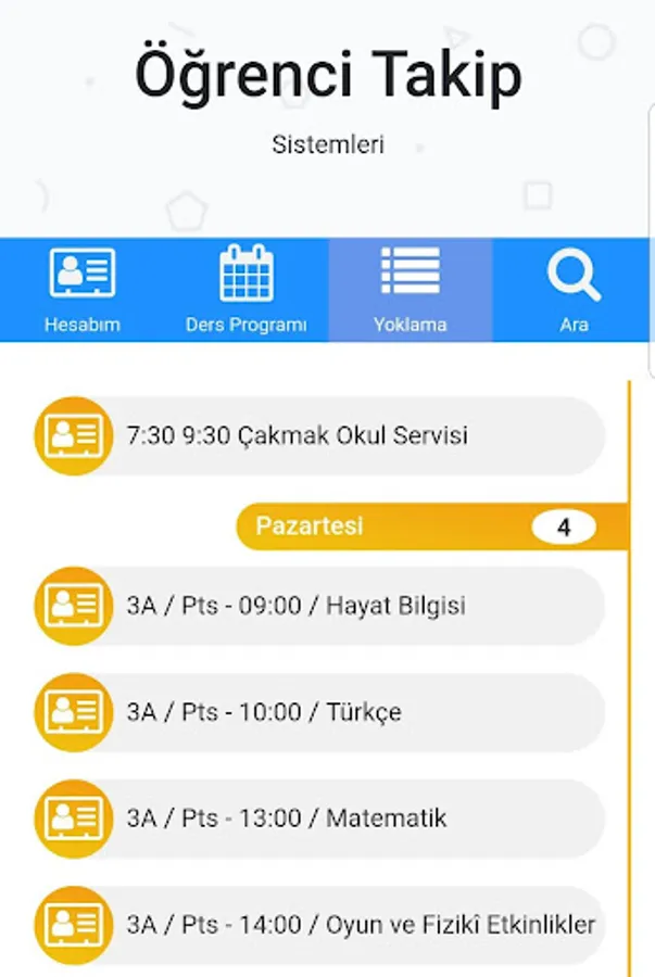 With the attendance system, you can see which lecture you are currently in and which courses you have. You will be able to see how many hours to go to school and how many hours they go to school. With service information you will be able to see the information on the service vehicle license plate driver and hostess.
