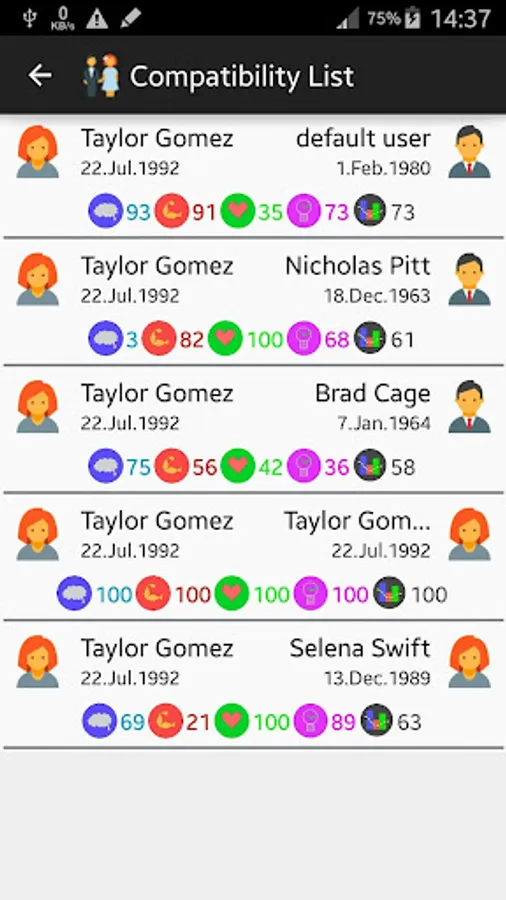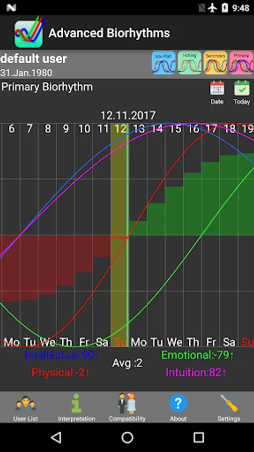 Quick and easy calculate the biorhythmic compatibility between the current selected user and the other users you have entered in the users list.