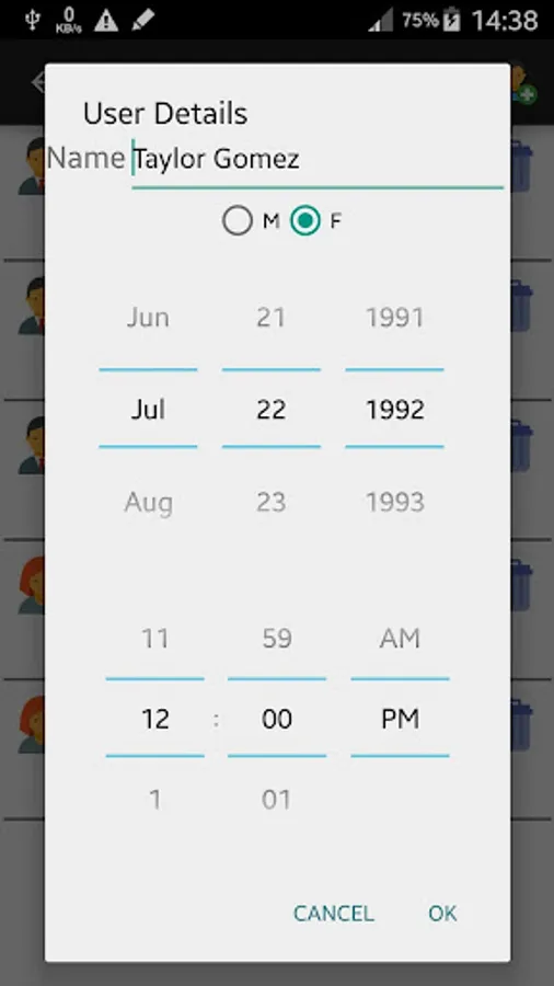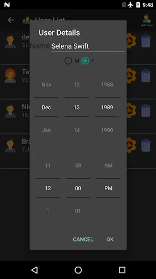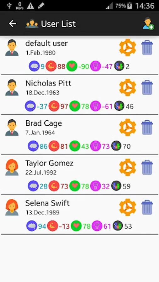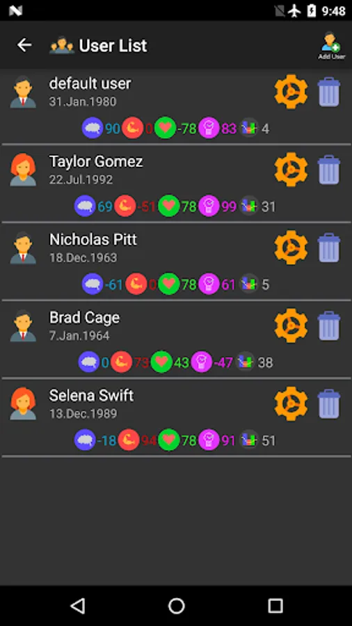 Add, edit and delete users for which to calculate the biorhythm and the biorhythm compatibility.