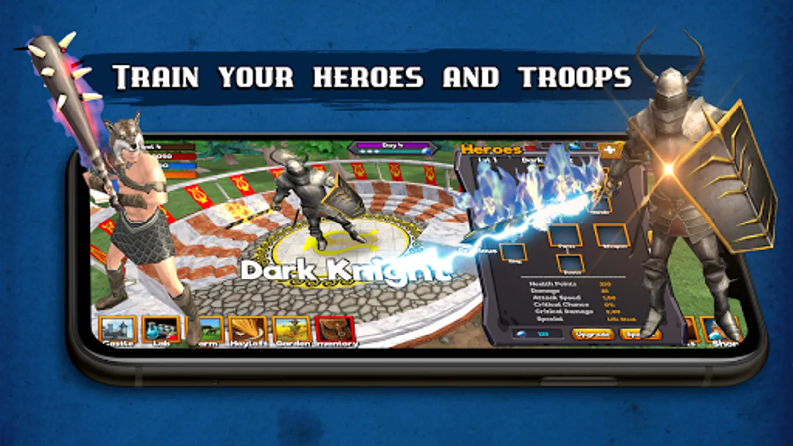 Your kingdom is protected by a wall that must be upgraded to keep up with enemies, as well as your other buildings. You also receive talent points that improve your troops.