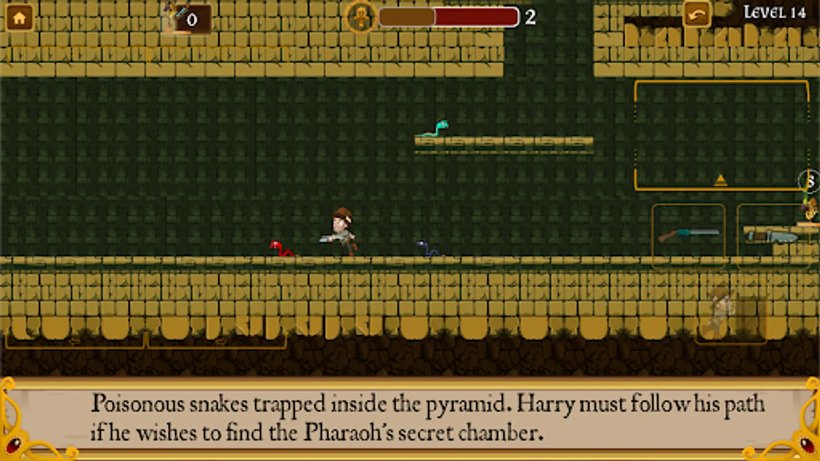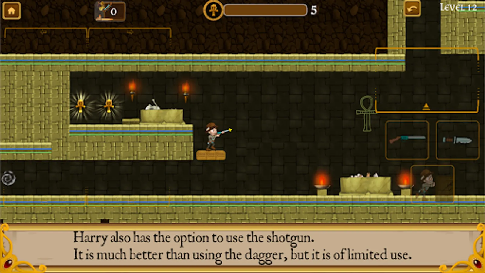 Harry can also make use of his shotgun, although in order to do so, he must find ammunition in strategic places in the pyramid.