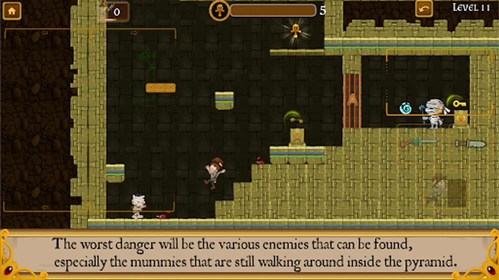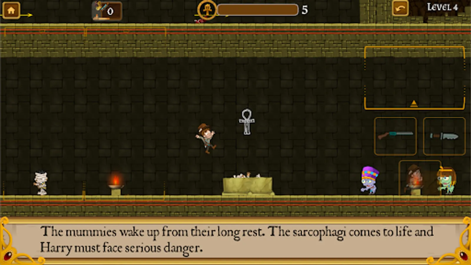 Inside the pyramid Harry can find many dangers: pits of death, scorpions, snakes, many traps and especially the mummies that have woken up from inside their sarcophagi and are still walking around inside the rooms.