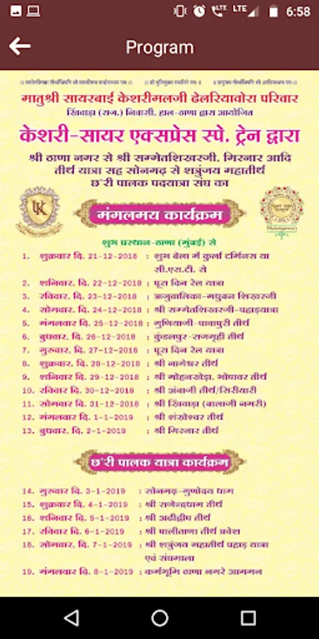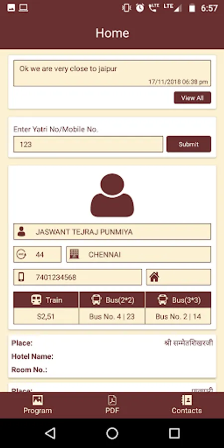 App provides complete details of each yatri for full schedule like name, contact no, city, age, train coach no, berth no, different buses no, tent no, dharamshala name and room no for each visiting place.