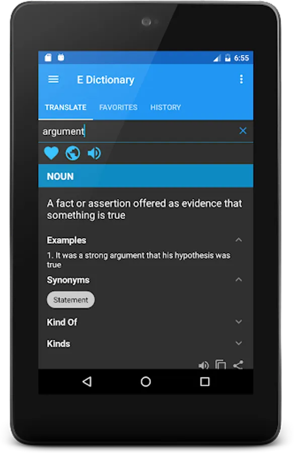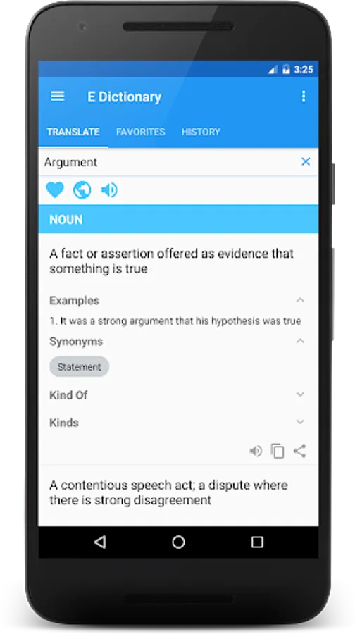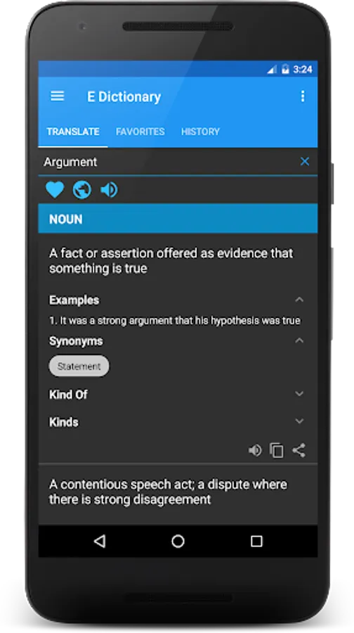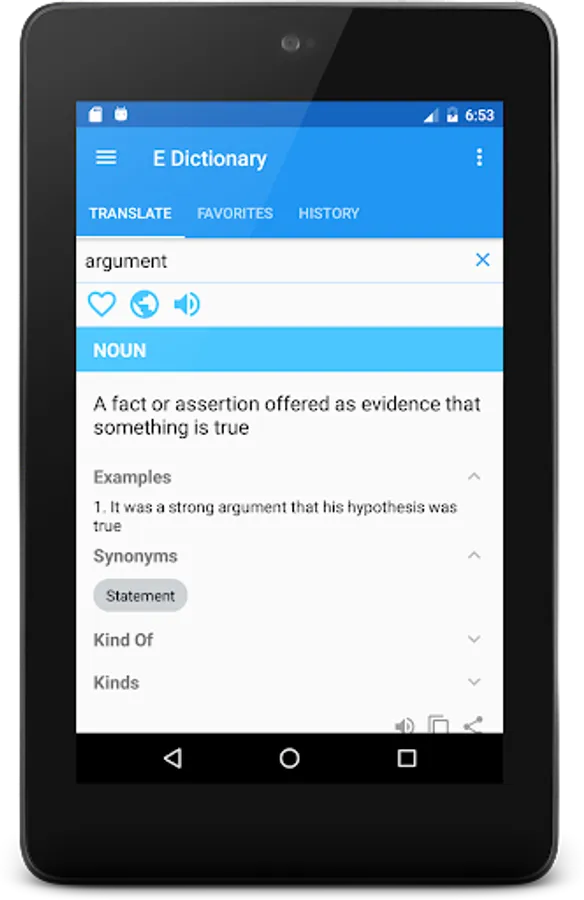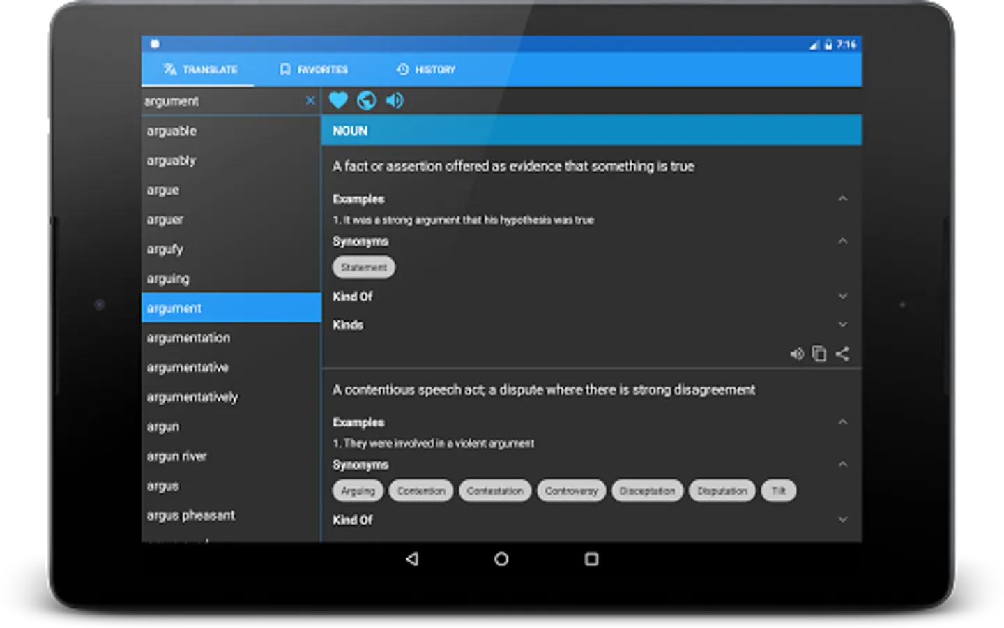 - Translation details like pos, synonyms, antonyms, kinds, kind of