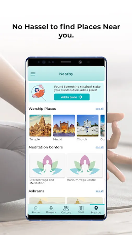 Nearby Places: Wherever you may be, the App alerts you to places of interest nearby like Ashrams or Meditation centers that match your preferences.