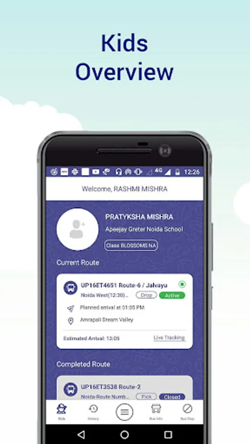 Kids home page will help the parents to get the latest information about the active route or completed route taken by their kids.