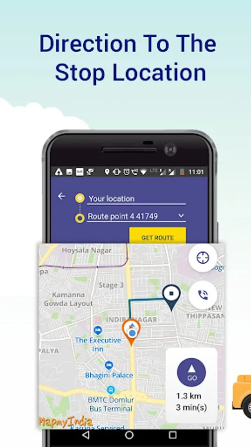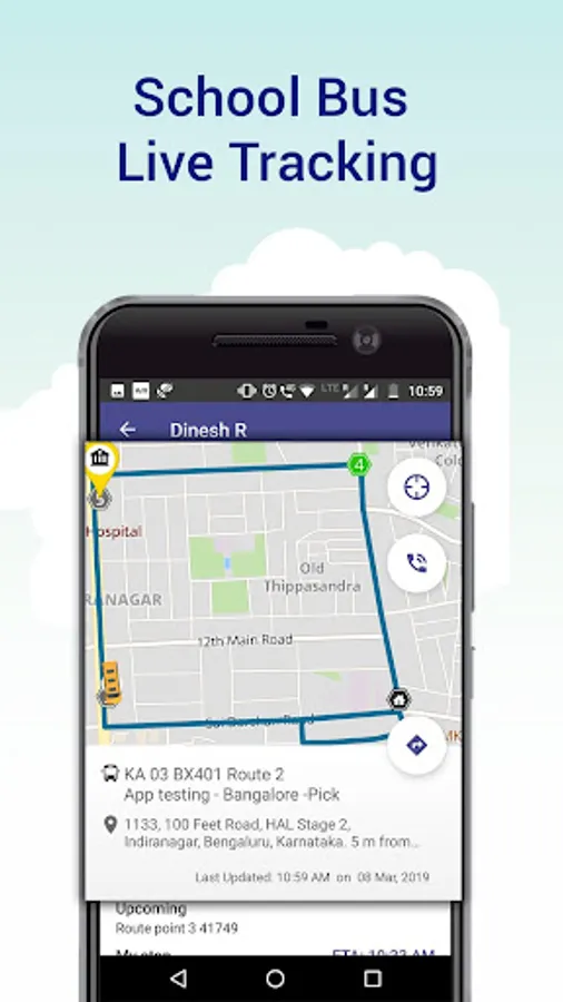 During route active time, live location of the bus along with the upcoming stop details will be provided to the parent.
