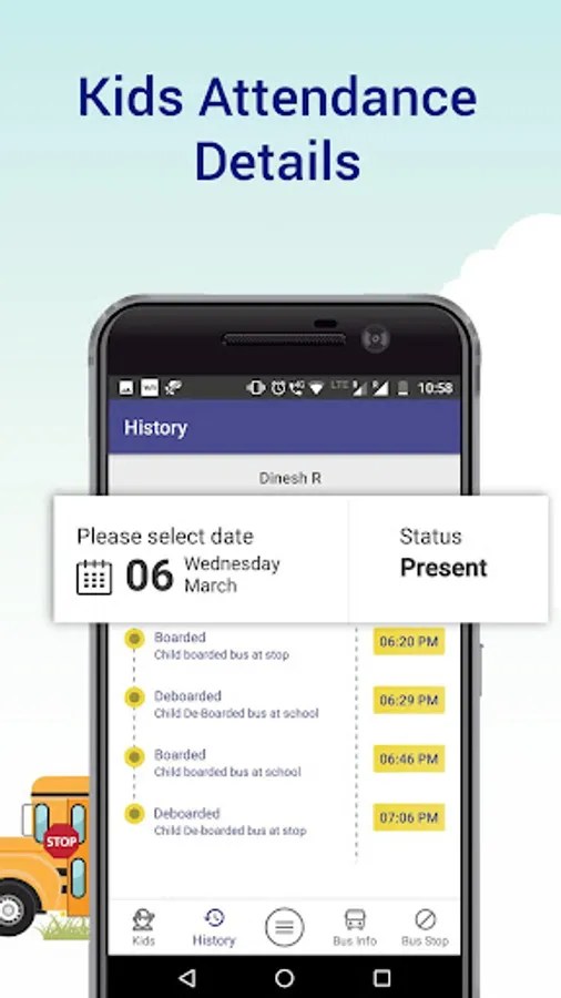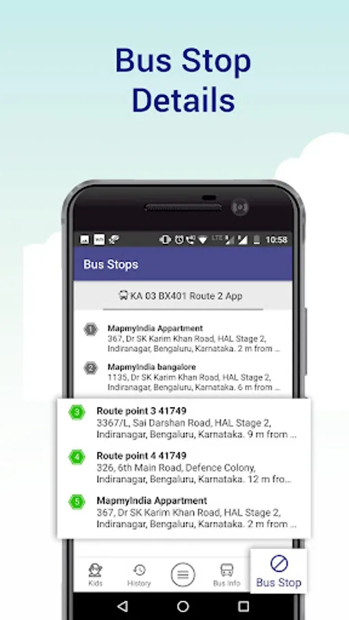 In case, if the kid deboards the bus at a stop other than the assigned stop, then the complete address will be shown in the app, which will be helpful to the parents to know the exact boarding and deboarding location of their kids.