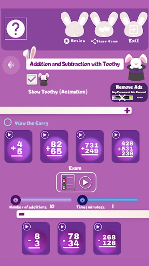 The best way to learn math! Practice addition and subtraction with Toothy the rabbit. Drag and drop numbers to complete equations, and track your progress with an optional exam. Great for kids and families!