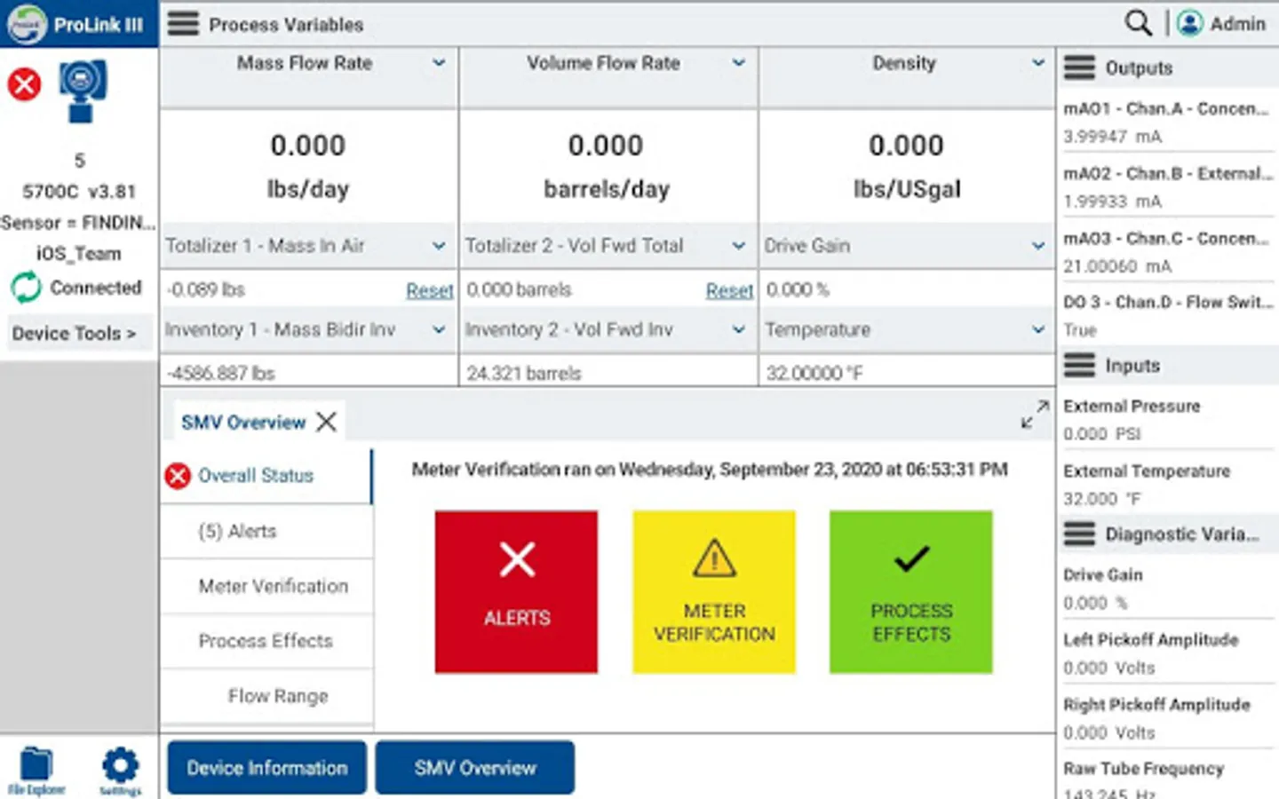 Featuring an intuitive interface, the ProLink III software application empowers you to easily access all the information you may need to configure, assess, and manage your Micro Motion Coriolis meter paired with a 5700 Config I/O transmitter with Wi-Fi.