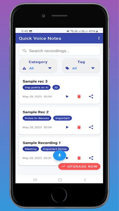 Whether you're recording lectures, meetings, interviews, personal reminders, or music practice sessions, Quick Voice Notes makes it easy to capture and organize important audio content.