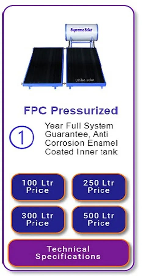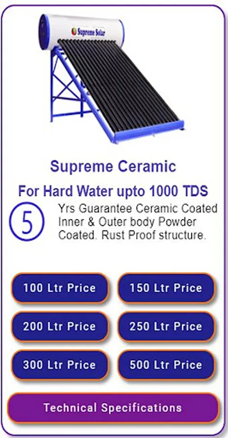 Supreme Solar water heater Available in following areas: Cantonment, Domlur, Indiranagar, Jeevanbheemanagar, Malleswaram, Sadashivanagar, Seshadripuram, Shivajinagar, Ulsoor, Vasanth Nagar, Bellandur, CV Raman Nagar, Hoodi, Krishnarajapuram, Mahadevapura, Marathahalli, Varthur, Whitefield, Banaswadi, HBR Layout, Horamavu, Kalyan Nagar, Kammanahalli, Lingarajapuram, Ramamurthy Nagar, Hebbal, Jalahalli, Mathikere, Peenya, R. T. Nagar, Vidyaranyapura, Yelahanka, Yeshwanthpur, Bommanahalli, Bommasandra, BTM Layout, Electronic City, HSR Layout, Koramangala, Madiwala, Banashankari, Basavanagudi, Girinagar, J. P. Nagar, Jayanagar, Kumaraswamy Layout, Padmanabhanagar, Uttarahalli, Anjanapura, Arekere, Begur, Gottigere, Hulimavu, Kothnur, Basaveshwaranagar, Kamakshipalya, Kengeri, Mahalakshmi Layout, Nagarbhavi, Nandini Layout, Nayandahalli, Rajajinagar, Rajarajeshwari Nagar, Vijayanagar, Attibele, Chandapura, Thavarekere, Chikkabanavara, Hesaraghatta, Jigani, Nelamangala, Sarjapura