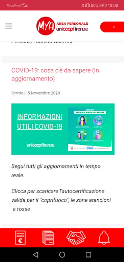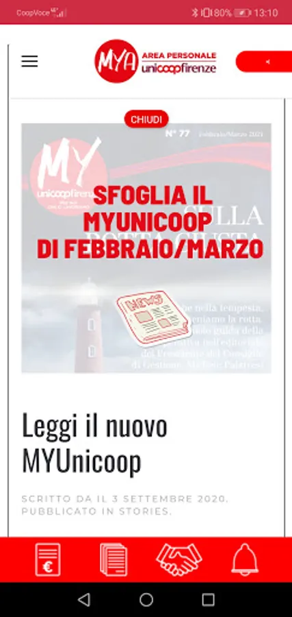 MYA is the app dedicated to Unicoop Firenze workers with many services designed for them. The app is divided into 4 areas: communication, personal services, training and utility. The app is a hub that facilitates and simplifies communication between Unicoop Firenze employees.