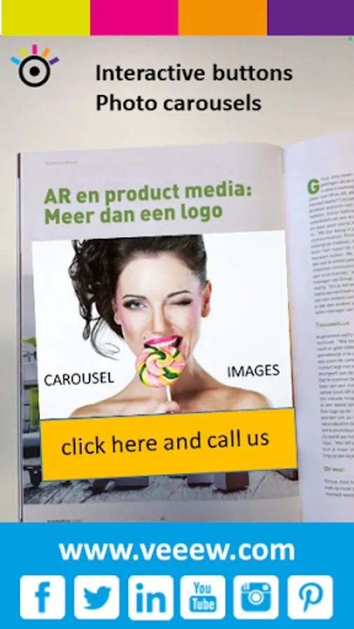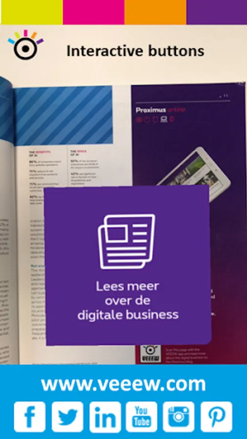 The generic app VEEEW allows the user to view a (printed) image via smartphone or tablet. It allows extra communication to start automatically in the app. This can take various interactive forms: video, animation, audio, interactive buttons (URL, e-mail, call, social media, etc.), a 3D view, etc. Language choices are also possible.