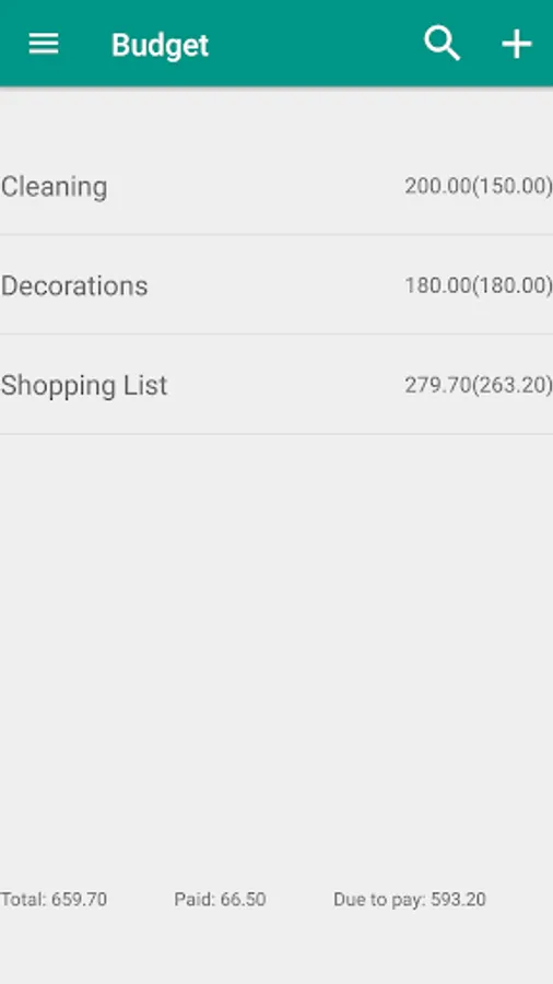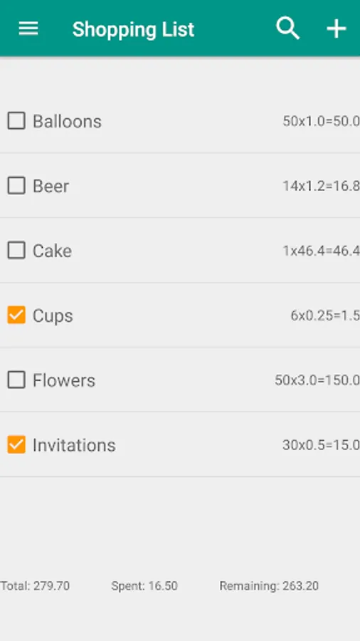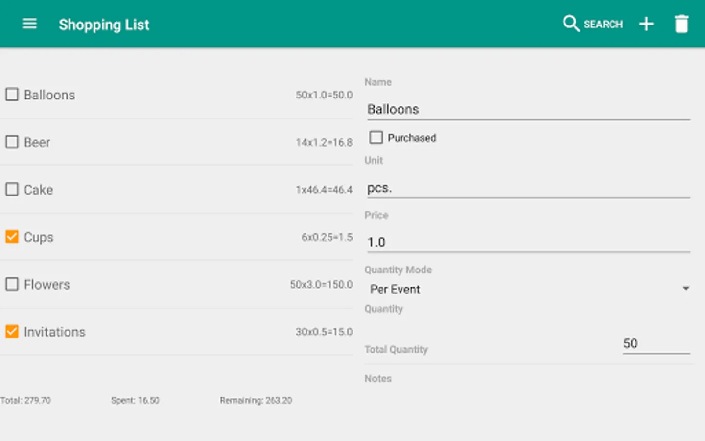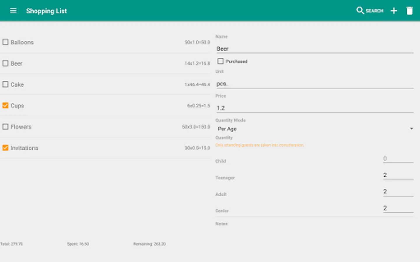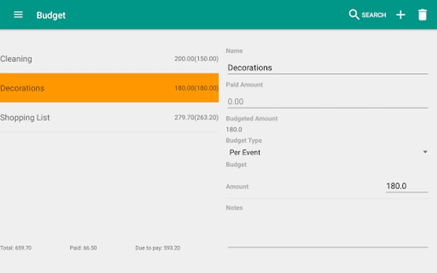 The shopping list and the budget tool will help you to keep under control the spendings for your wedding / party / event.
