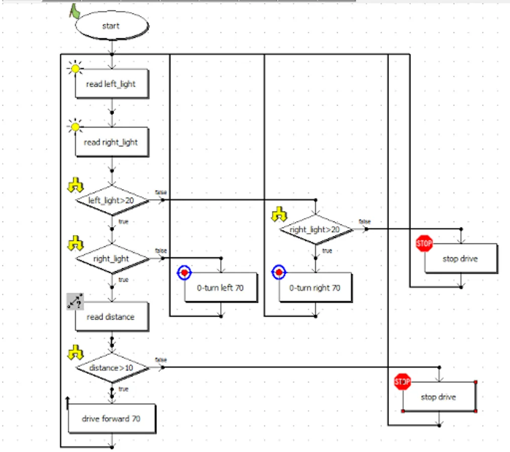Connect the light and distance sensors on the robot and the engine needed connections.