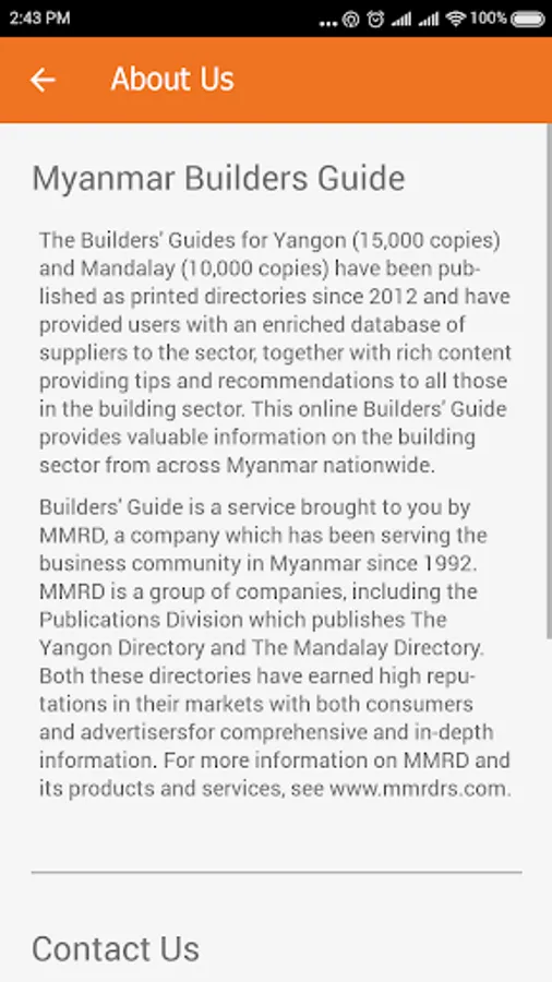 Builders’ Guide is a service brought to you by MMRD, a company which has been serving the business community in Myanmar since 1992. MMRD is a group of companies, including the Publications Division which publishes The Yangon Directory and The Mandalay Directory. Both these directories have earned high reputations in their markets with both consumers and advertisersfor comprehensive and in-depth information. For more information on MMRD and its products & services, see www.mmrdrs.com.