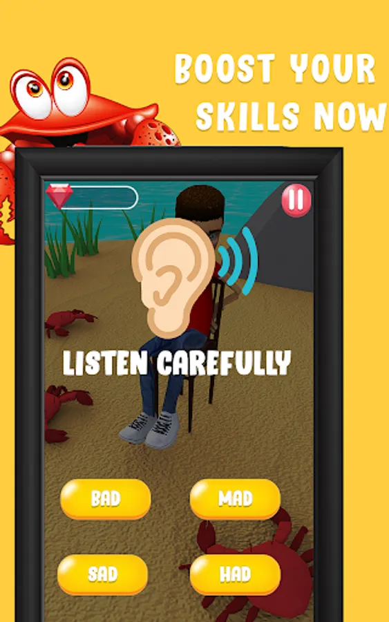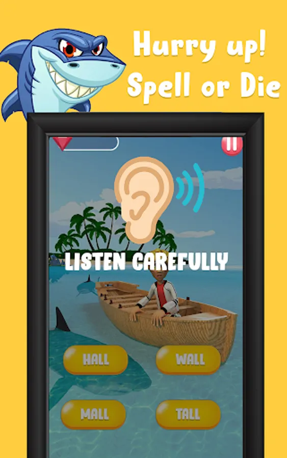 This game is about guessing the right spelling that is being said out loud in a voice-over and users will be given two to four options to choose from. There will be one character that will be depicted as a user who is playing. If the user chooses and guesses the right option after listening, the voice-over level will complete, otherwise, the user dies and the level will fail.