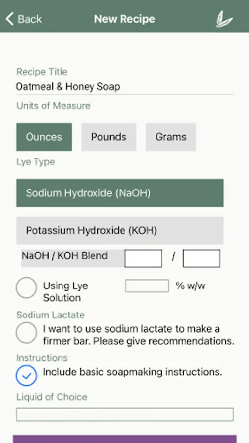 Majestic Mountain Sage's Lye Calculator™ is a tool for soapmakers to create new soap recipes. The Lye Calculator™ will calculate the amount of lye (either sodium hydroxide or potassium hydroxide) required to convert the specified amount of fats and oils to soap. The Lye Calculator™ is provided free of charge, but it is copyrighted material and cannot be copied. The recipes that are generated are the intellectual property of the creator. Majestic Mountain Sage makes no claim on recipes, or resulting soap, that are created using the Lye Calculator™.