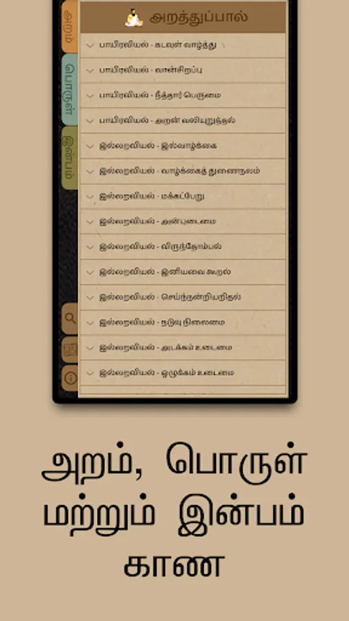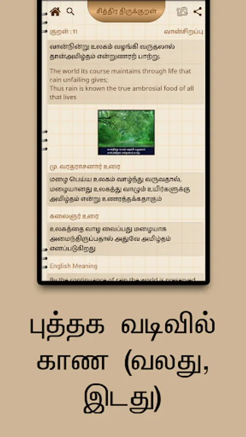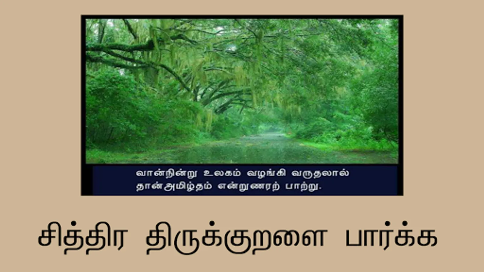 The classic Tamil Literature with suitable picturesque images. This is a handy App for Thirukkural Lovers. This application shows daily a Thirukkural with its meaning in Tamil and English.