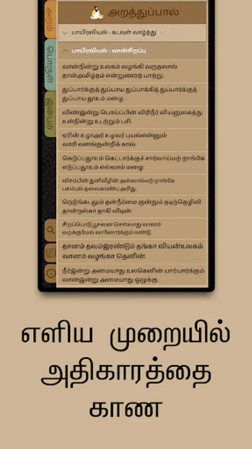 You can search any Thirukkural(s), also lookup by Thirukkural Number.